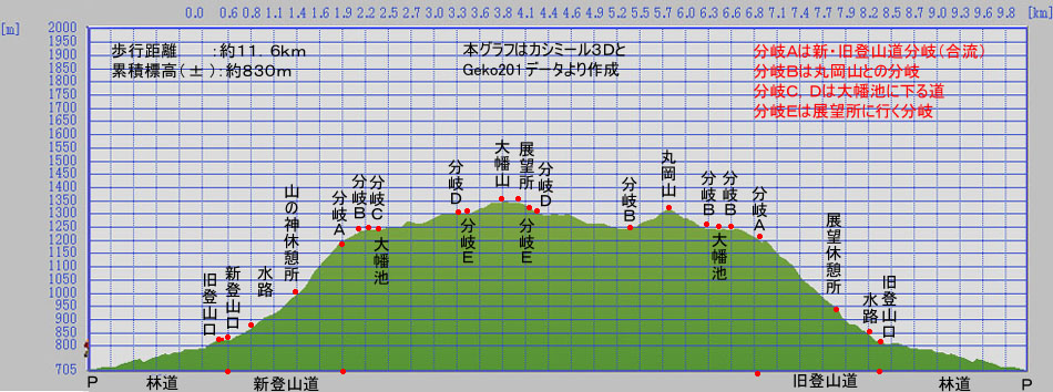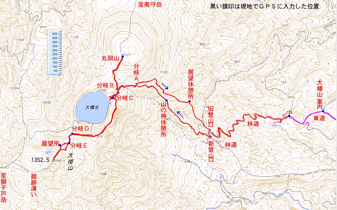 | 所要時間 : 林道脇(P)8:48 →旧登山口9:24 →新登山口9:26 →山の神休憩所9:52 →分岐A10:24 →分岐B10:38 →分岐C →大幡池10:42 →(斜面を歩く) →分岐E →分岐D →大幡山11:26〜11:48 →展望所11:52 →分岐E →分岐B12:15 →丸岡山12:32 →分岐B →大幡池12:52〜13:13 →分岐A13:23 →(旧登山道) →展望休憩所13:43 →旧登山口14:12 →林道脇(P)14:43 |