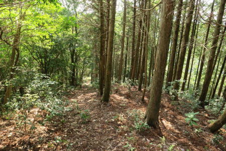 | 伐採地に着いた時、この山は私有林!だと思い植林された杉の所を歩かないように下った。 |